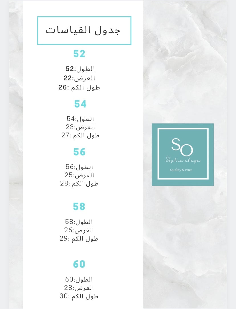 جدول القياسات يخص منتجات عبايات صوفيا فقط